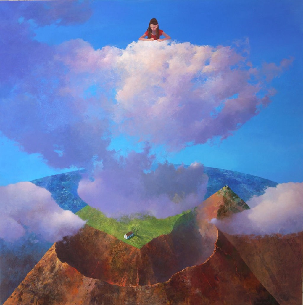 - Under denna tid upplevde jag både målardukens ytmässiga begränsningar och mina egna. Det var så jag fick idén till denna målning. Hon skulle sitta där uppe på "Guds tron" i en skyddad värld för barn och titta ner mot den mörka avgrunden på jorden, där konflikter och elände ständigt pågår. I flera veckor målade jag svärtan i målningens nedre del och jag var stundtals inne i konsthistoriens mörka bilder av krig och fasor. Ju mer jag målade detta plågsamma mörker desto sämre började jag må och kände mig riktigt plågad under arbetets gång tills jag en dag inte längre orkade fortsätta betrakta helvetesskildringen och jag var tvungen att måla över en del i bildens nedre del. Det är anledningen till att jag, för det mesta känner mig tvungen att måla det vackra och göra plats för sereniteten. Men i kratern i målningen gapar ännu något hotfullt och de röda lavaströmmarna är kvar; faror lurar konstant i den klaraste av sommarens dagar men huset står ännu stadigt och inbjudande i grönskan vid den (övermålade) katastrofens brant.