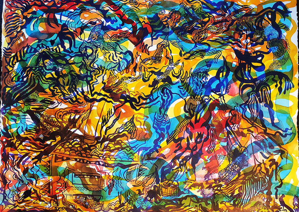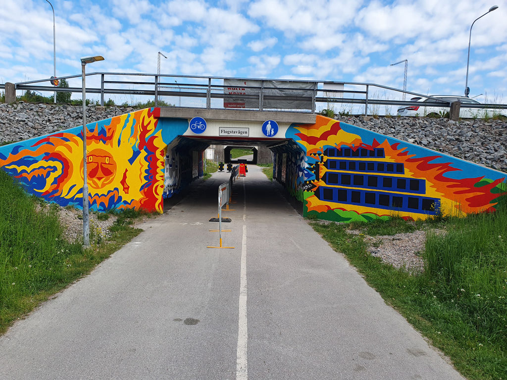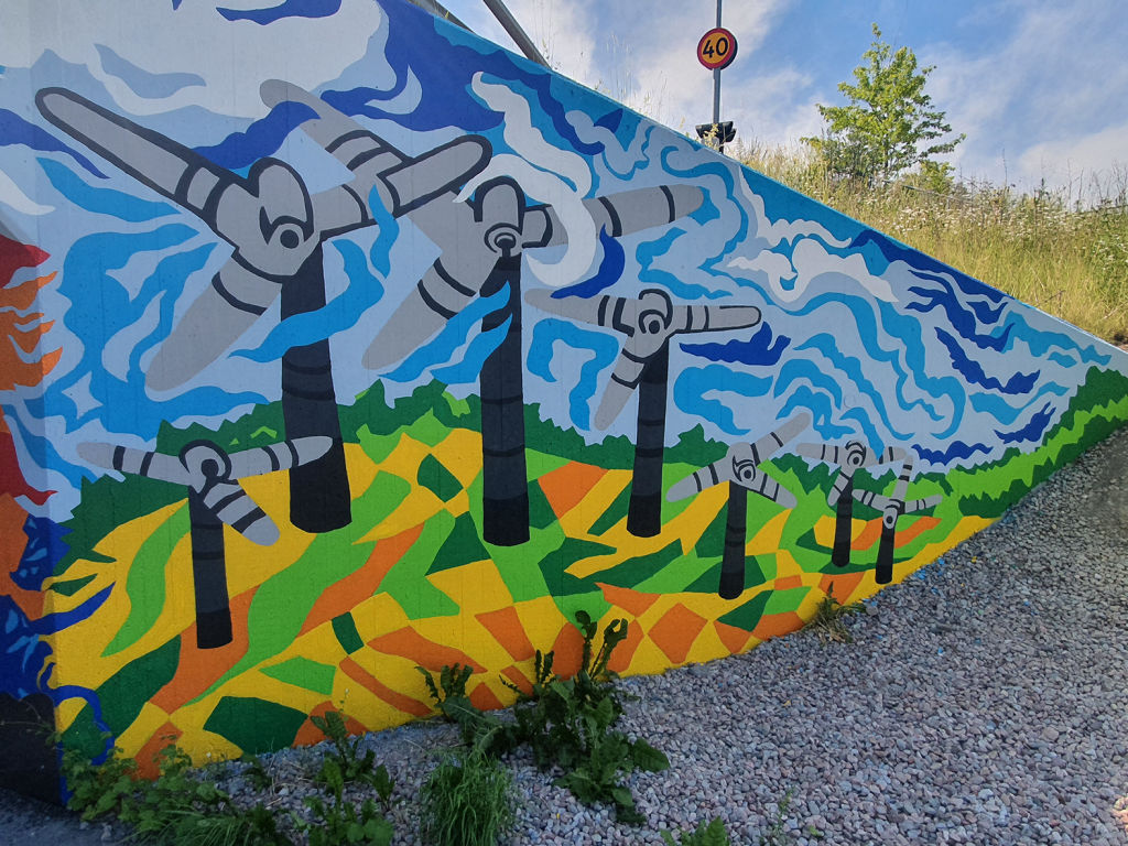 Väggmålningen "Naturens krafter", uppförd i Flogsta, Uppsala. Beställd av Uppsala Kulturförvaltning. (2020)