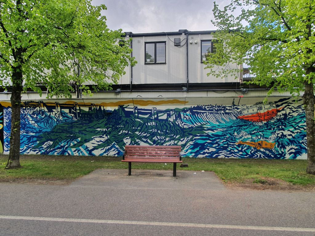 Verket "Vattenkraft - Tågkraft", uppförd på ett byggplank tillhörande bygget av järnvägstunneln Västlänken i Göteborg. (2021)