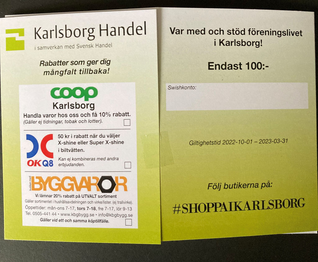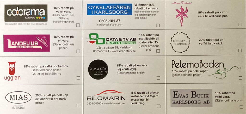 Karlsborgs Konstförening säljer Karlsborg Handels rabatthäfte till stöd för föreningslivet i kommunen. Vill du vara med och stödja oss genom att köpa häften? Om så är fallet; maila monika.lofving@telia.com eller ring/smsa 070-542 50 29, så levererar vi . Häftet kostar 100 kr och av dessa får föreningen 50 kr, vilka används till våra aktiviteter under året. Nedan kan du se vilka företag som ingår i häftet. Förutom dessa får du 10% rabatt på entrébiljett till Fästningsmuseet. Välkommen att höra av dig!