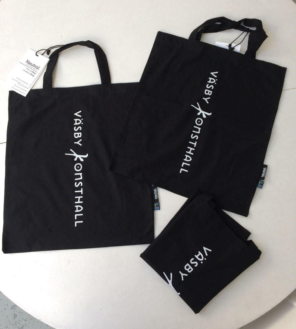 Svart tygkasse i bomull med vit text, Väsby Konsthall, pris 60 kr