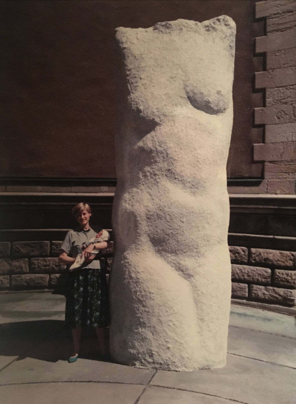 - Jag gick ut Konsthögskolan 1984 och samtidigt som jag slutade så födde jag mitt tredje barn, Ellen. Medan magen växte den vintern så gjorde jag en 3,60 meter hög betongtorso som nu finns på Henriksdalsberget i Nacka. Skulptören Bård Breivik var professor på Konsthögskolan då. Jag arbetade med enorma cellplastblock och jag satt som en liten råtta på blocken och karvade med en morakniv. Bård kom in och ställde sig i dörröppningen och tittade på mig och skakade på huvudet och sa; “det där blir inte lätt” och så gick han och då tänkte jag bara; "nä, nu jävlar ska jag visa honom". Under processens fortskridande så var Bård på en konstresa och var borta i tre månader. När han kom tillbaka igen och kom in i modellsalen så hade jag kommit väldigt långt på skulpturen och stod högt upp på en stege med magen i vädret och då sa han: “åh fan, det trodde jag inte”. På min avslutningsutställning så fick jag ett fint stipendium som de inte hade delat ut till en kvinnlig skulptör på många år.