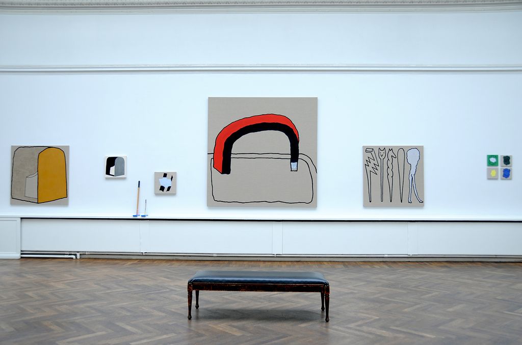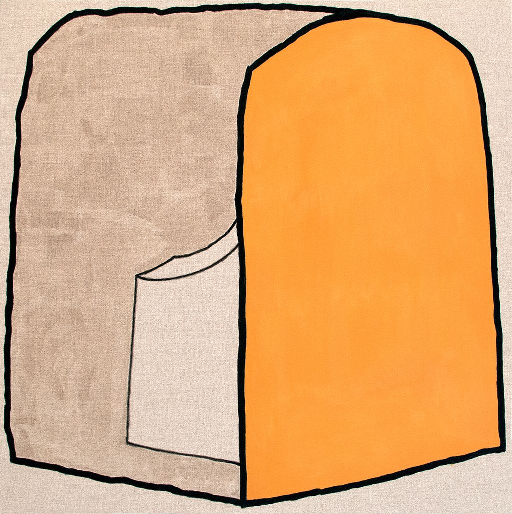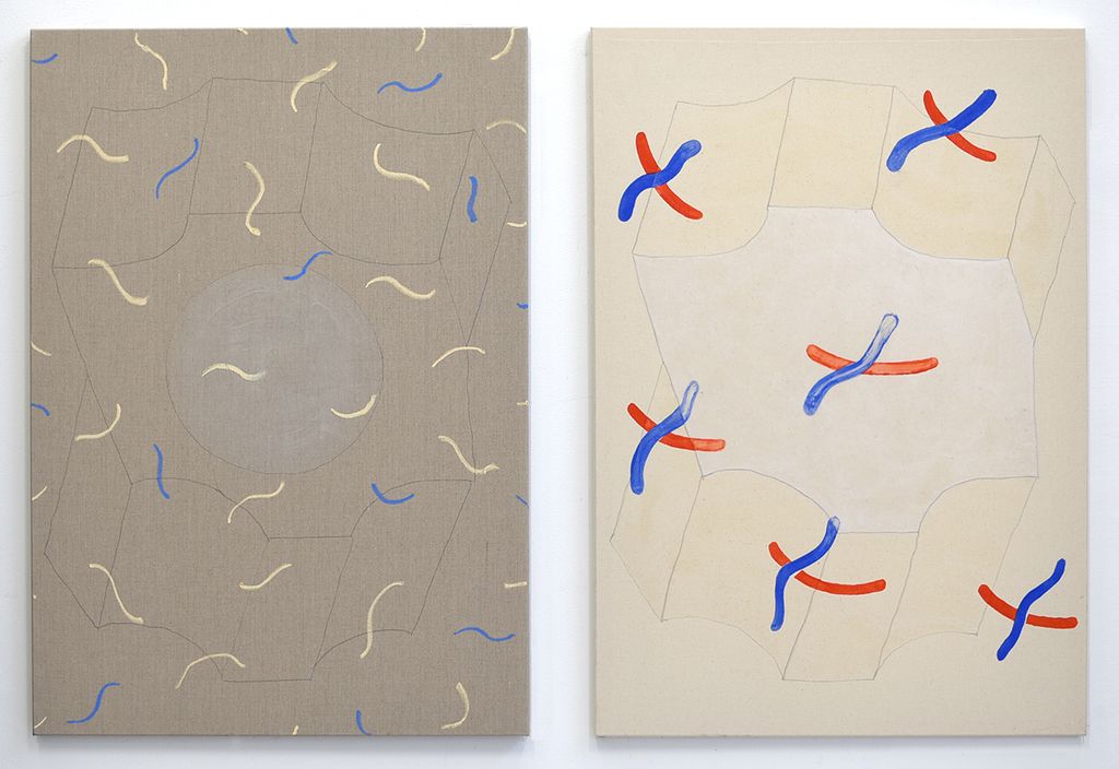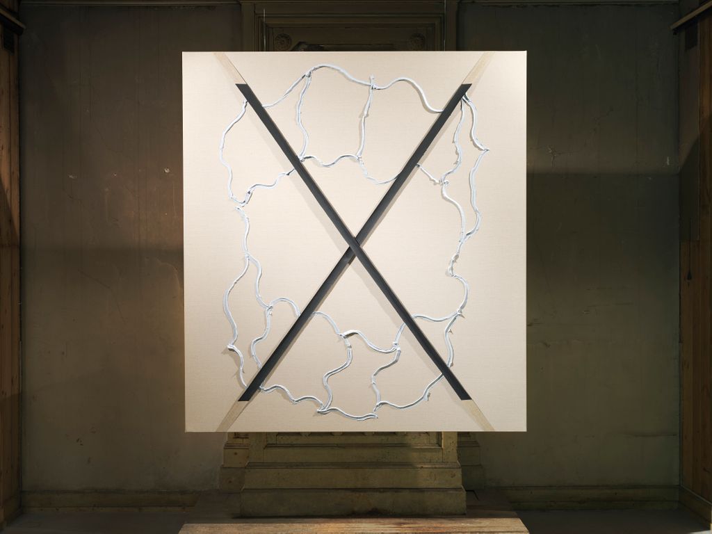 En duk ryms i en geometrisk form, ja även den asymmetriska. Det finns alltid en form att förhålla sig till som konstnär, men formen kan inte existera oberoende av strukturen som konstruerar den. Det finns föreskrivna regler som jag måste förhålla mig till för att kunna bryta den logiken. I en slags intuitiv logik!