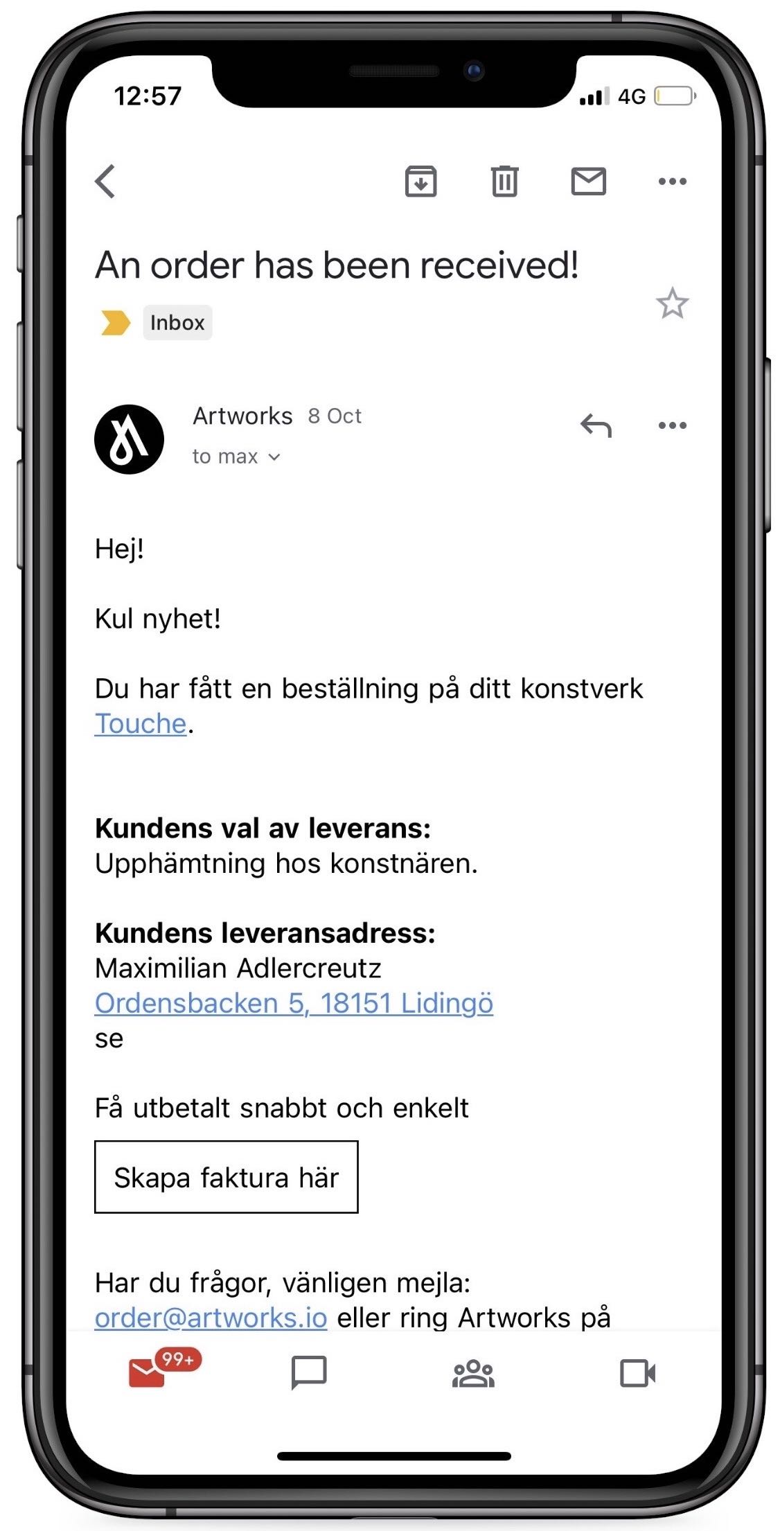Du får en orderbekräftelse via mail med kundens uppgifter och val av leverans. Önskar kunden få verket levererat och detta inte räknats in i priset så behöver du fakturera kunden separat för detta. I samma mail finns det en knapp “Skapa Faktura” där du ser över att samtliga detaljer stämmer och därefter “Skickar faktura”. När detta är gjort får du det underlag du behöver för din egna bokföring och din utbetalning är hos dig inom 14 dagar.