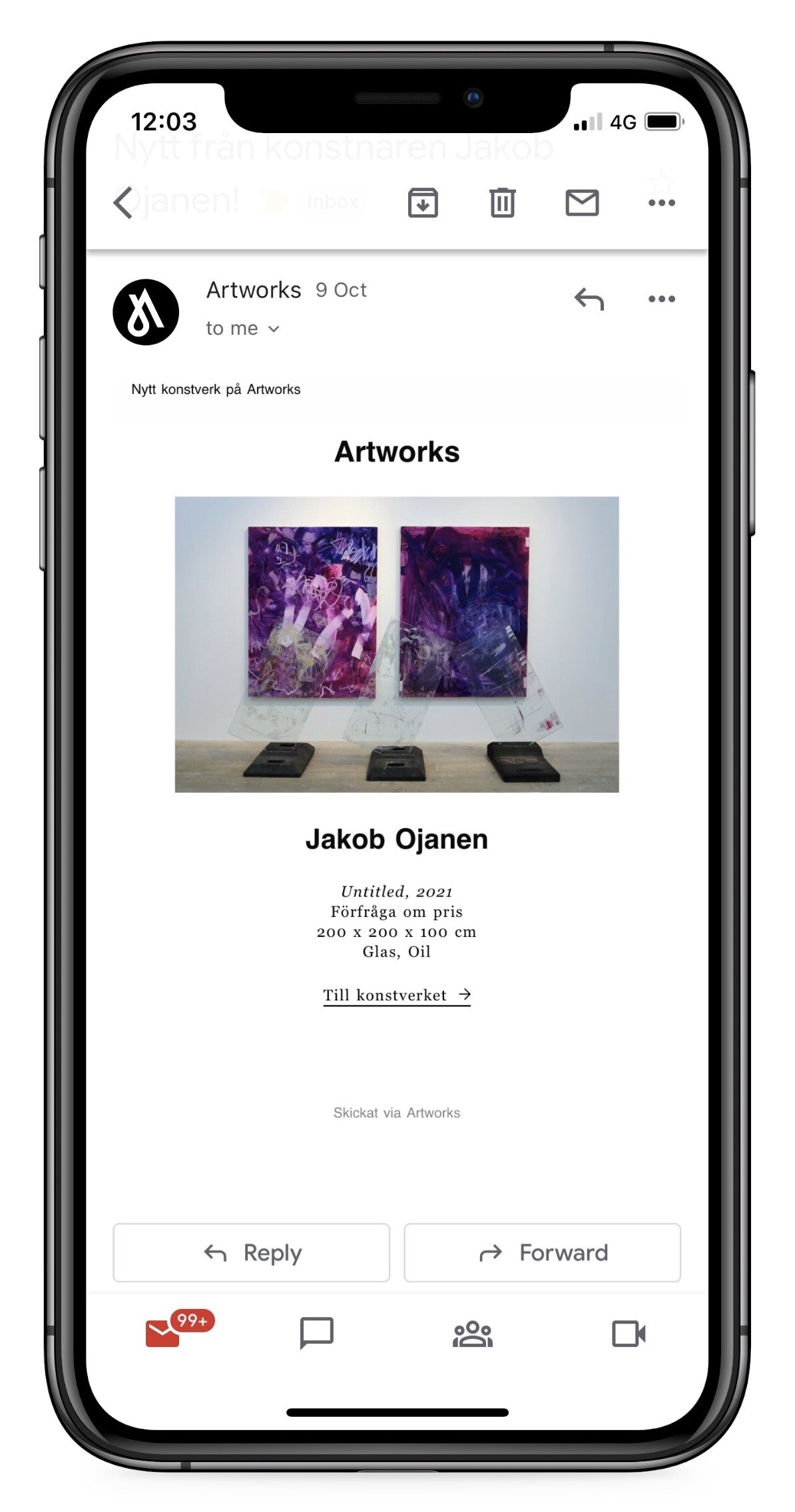 Följare får automatiska aviseringar när du som konstnär lägger till nya verk eller deltar i en utställning.