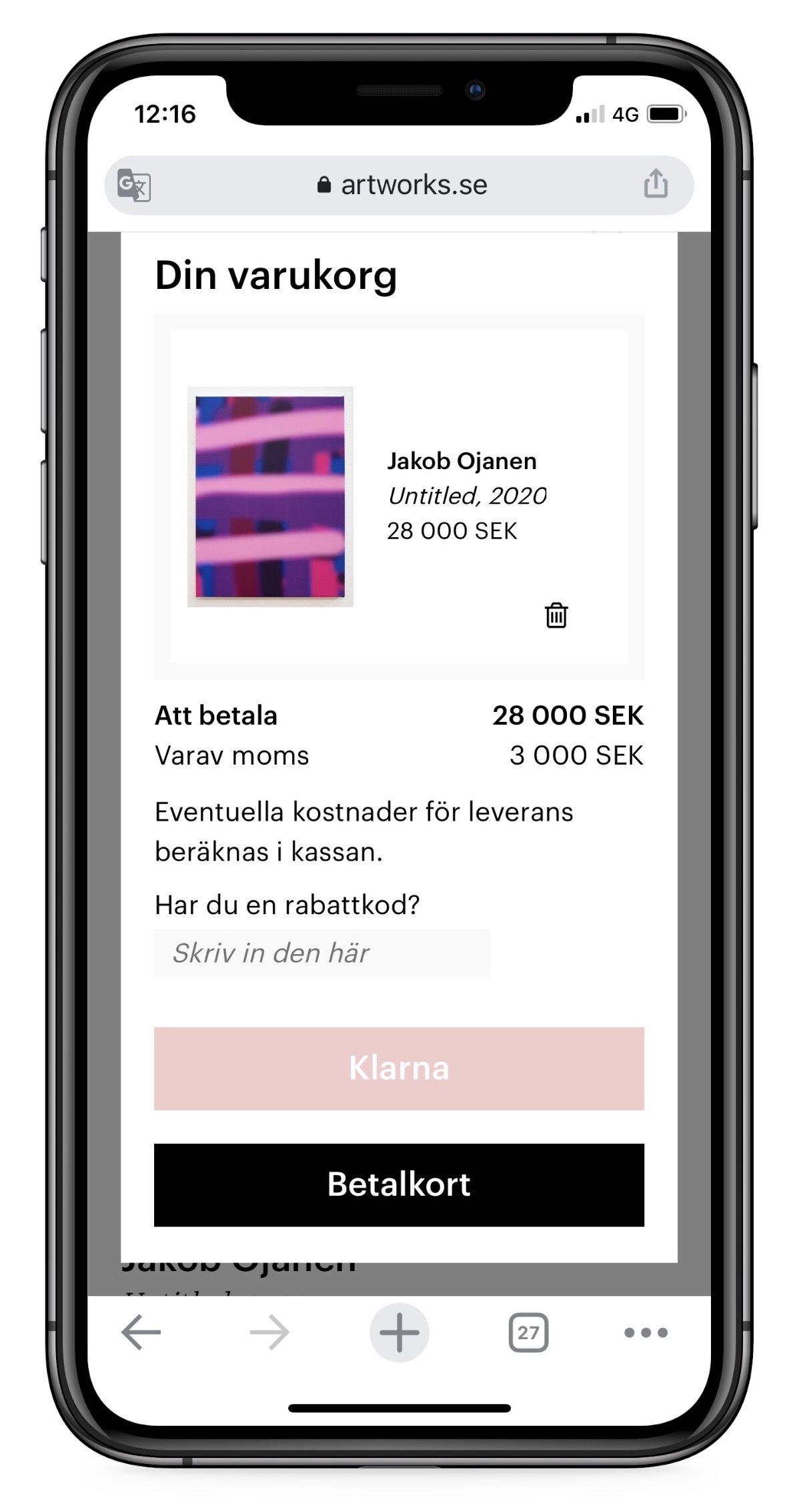 Med direktbetalning så har kunden möjlighet att köpa verket utan att skicka en förfrågan. Detta är idag vanligast vid försäljningar och ämnar du att sälja konst via plattformen så råder vi dig att tillgängliggöra så många verk som möjligt för direktbetalning. OBS kom ihåg att uppdatera verkets status om det inte längre skulle vara tillgängligt för att undvika att en kund handlar ett verk som inte längre är till salu.